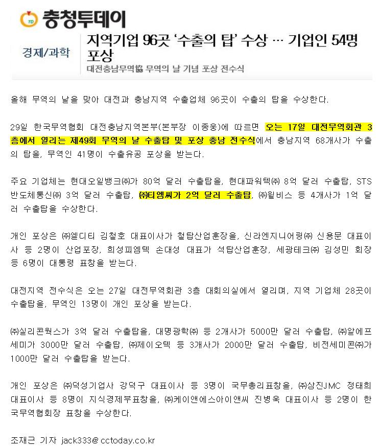 미디어 티엠씨, 2억불 수출의 탑 수상(충청투데이, 12/6) 페이지 정보 작성일 : 12-12-07 조회수 : 24,799회 본문 목록 이전글글로벌 전선 강국 위상 '공고히' (전기신문, 12/10) 12.12.11 다음글(2012 전선특집)티엠씨(전기신문, 11/19) 12.11.20