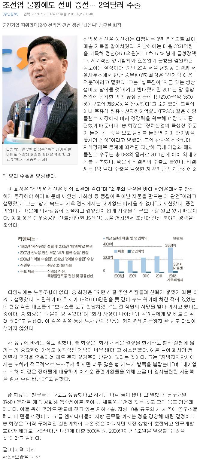 조선업 불황에도 설비 증설… 2억달러 수출(중앙일보, 2/25) 페이지 정보 작성일 : 13-02-25 조회수 : 25,423회 본문 목록 이전글창립 22주년 기념식(3. 18) 13.03.20 다음글(터닝포인트) 티엠씨 신성장동력 확보 (전기신문, 1/3) 13.01.07