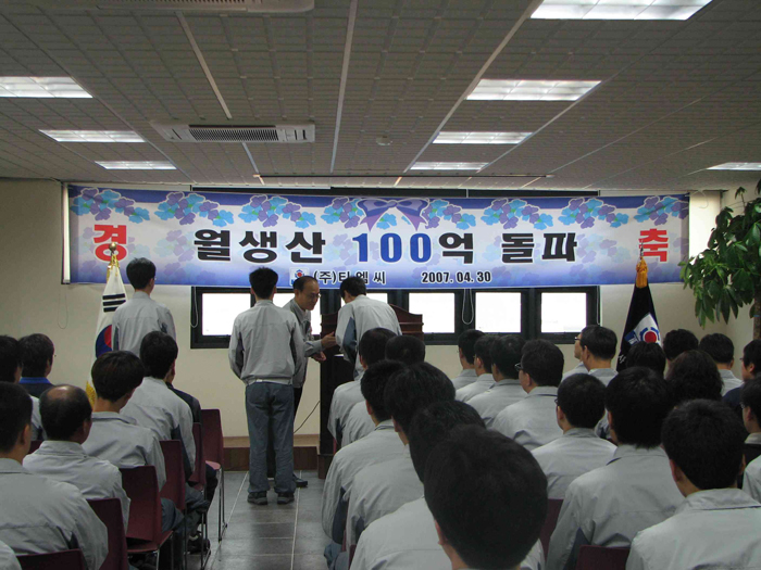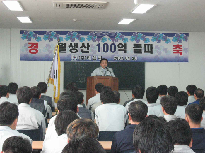 5월 월례조회 페이지 정보 작성일 : 07-05-08 조회수 : 27,182회 본문 당사는 5월 8일(화) 오전 8시 30분 입장/북면 공장에서 5월 월례조회를 실시하였습니다. 이날 조회에서 봄맞이 족구대회 시상 및 4월 개선 제안 활동과 공동과제개선에 대한 시상이 있었으며 월 생산 100억원 돌파를 기념하는 의미있는 자리이기도 했습니다. 송무현 대표이사께서는 조회사를 통해서 “생산 목표 달성을 위하여 열심히 땀 흘려 준 모든 직원들에 대한 감사”의 말씀과 “생산 증대와 더불어 생산효율 향상 및 품질안정에 최선을 다하여 줄 것”을 당부하셨습니다. 또한 개선제안 및 공동과제 개선에 대한 치하와 함께 “앞으로도 개선활동이 실질적인 수익개선에 기여할 수 있도록 적극적으로 지원, 포상할 것”이라고 강조하셨습니다. 앞으로도 당사는 납기준수와 품질안정을 통한 고객감동에 최선을 다하겠습니다. 목록 이전글OTC(Offshore Technology Conference)2007 전시회 참가 07.05.14 다음글TMC, 창립 16주년 맞아 새 도약 다짐(전기신문) 07.03.26