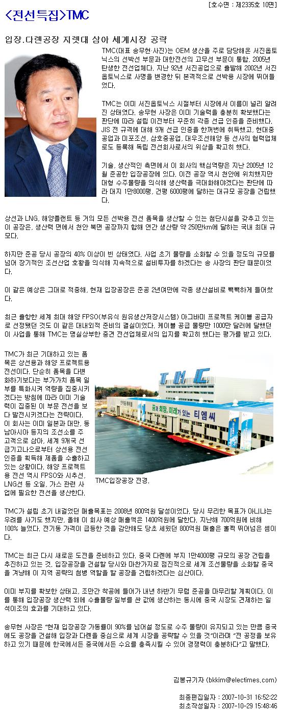 전기신문 <전선특집 TMC> 기사(10.31.) 페이지 정보 작성일 : 07-11-02 조회수 : 27,395회 본문 목록 이전글당사가 케이블 납품한 삼성중공업 드릴쉽(STENA Drillship) 사진 및 관련기사 07.11.13 다음글천안시 기업인 종합대상 수상 07.10.19