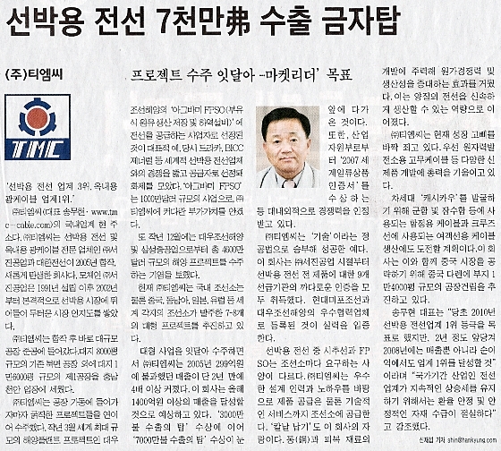 (주) 티엠씨‥선박용 전선 7천만弗 수출 금자탑(한국경제,11/27) 페이지 정보 작성일 : 07-11-27 조회수 : 27,844회 본문 목록 이전글대한전선, PRYSMIAN 임원 방문(11/27) 07.11.28 다음글당사가 케이블 납품한 삼성중공업 드릴쉽(STENA Drillship) 사진 및 관련기사 07.11.13