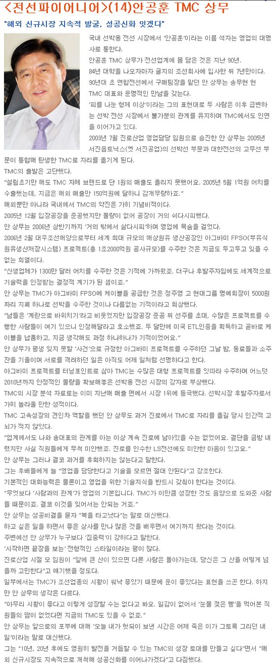 전선파이어니어-안공훈 TMC 상무(전기신문, 9/22) 페이지 정보 작성일 : 08-09-22 조회수 : 27,755회 본문 목록 이전글전선특집-초경쟁 TMC (전기신문, 9/29) 08.09.30 다음글OHSAS 18001 취득 08.08.11