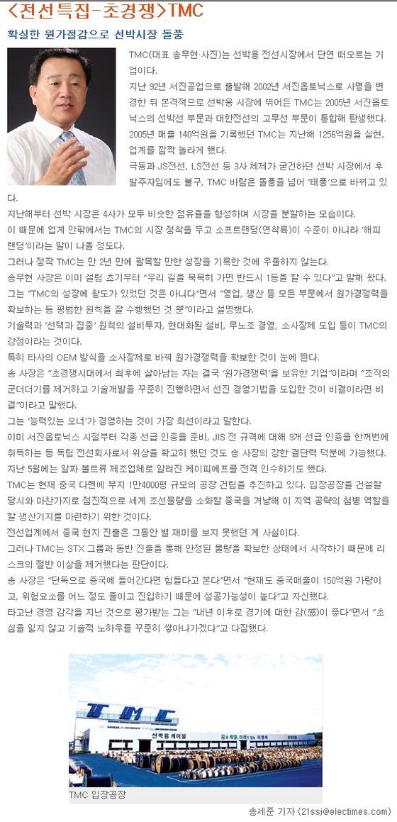 전선특집-초경쟁 TMC (전기신문, 9/29) 페이지 정보 작성일 : 08-09-30 조회수 : 28,273회 본문 목록 이전글TMC 한마음 체육대회 실시(10.4) 08.10.07 다음글전선파이어니어-안공훈 TMC 상무(전기신문, 9/22) 08.09.22
