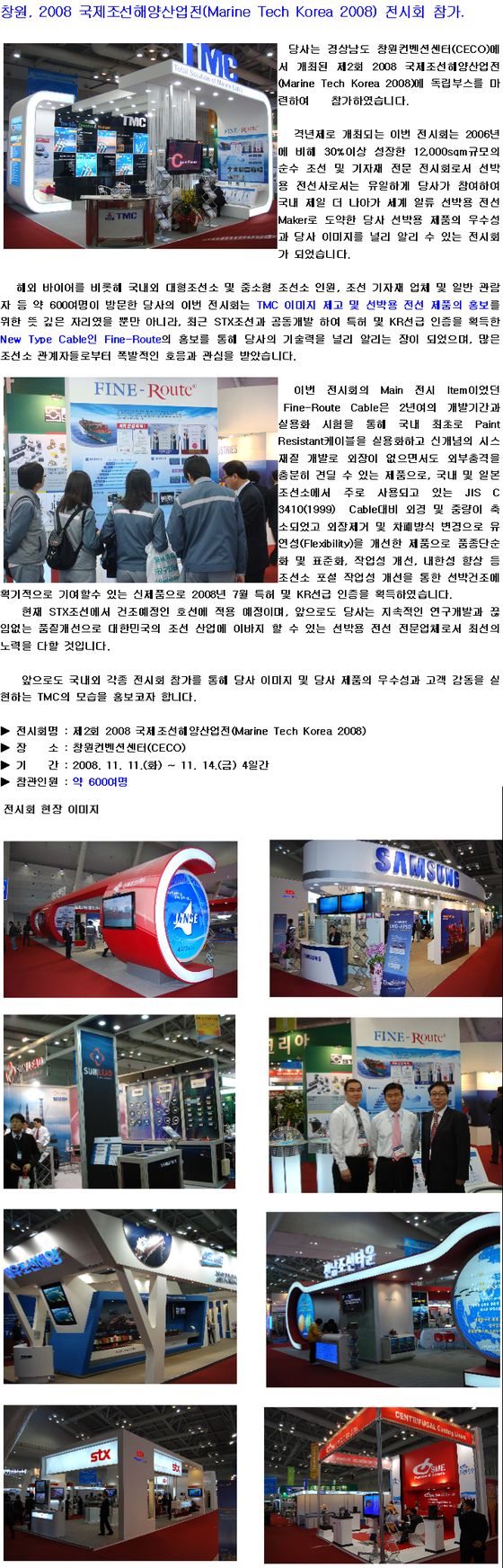 2008 국제조선해양산업전 참가(11.11~14) 페이지 정보 작성일 : 08-11-19 조회수 : 28,076회 본문 목록 이전글1억불 수출의 탑 및 철탑산업훈장 수상 08.12.03 다음글2008 국제조선 해양산업전 참가 안내(11/11~14) 08.11.03