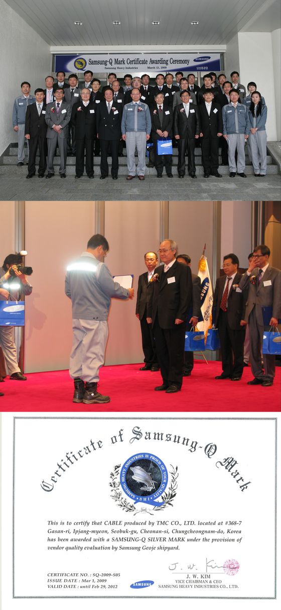 삼성 Q SILVER MARK 인증 획득 페이지 정보 작성일 : 09-03-16 조회수 : 28,666회 본문 삼성중공업은 매년 기자재 협력업체를 종합평가하여 우수업체에 대하여 SAMSUNG Q-MARK 인증서를 수여, 인센티브를 부여하고 있습니다. 지난 3월 13일 거제삼성호텔에서 열린 인증서 수여식에서 당사는 전선제조업체로서는 유일하게 Q SILVER MARK 업체로 선정되었습니다. 당사는 이에 만족하지 않고 고객을 위한 더 나은 품질, 고객을 위한 더 좋은 서비스를 추구하는 TMC가 되도록 노력하겠습니다. 목록 이전글송무현 대표이사 한국무역학회 무역진흥상 수상 09.04.27 다음글전선업계 전망과 주목기업/티엠씨(전기신문, 1/5) 09.01.06