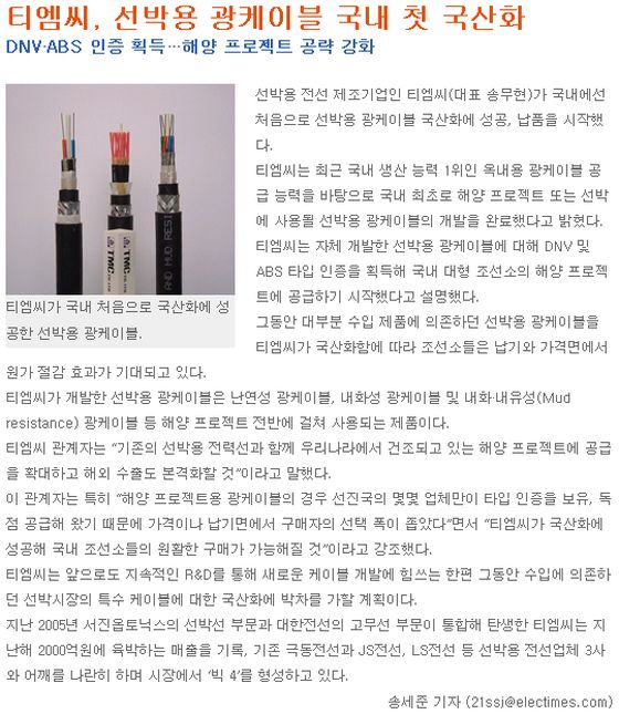 미디어 티엠씨, 선박용 광케이블 국내 첫 국산화(전기신문, 9/28) 페이지 정보 작성일 : 09-09-29 조회수 : 29,301회 본문 목록 이전글2009 국제조선해양대전(Marine Week 2009) 참가 09.10.29 다음글NOR-SHIPPING 2009 전시회 참가 09.06.19