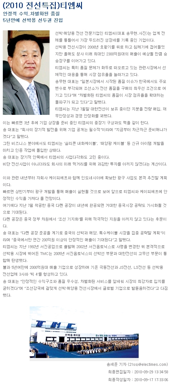 (2010 전선특집)티엠씨(전기신문, 9/29) 페이지 정보 작성일 : 10-09-30 조회수 : 31,083회 본문 목록 이전글2011년 시무식 개최(1.4) 11.01.04 다음글창립 19주년 기념행사(3.19) 10.03.22